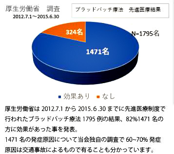 厚生労働省は2012.7.1 から2015.6.30 までに先進医療制度で行われたブラッドパッチ療法1795 例の結果、82%1471 名の方に効果があった事を発表。厚生劳动省从2012 年7 月1 日开始到2015 年6 月30 日为止,采用先端医疗制度,对1795 名患者实施了硬膜外自体血注射疗法,结果显示对82%的1471 名患者都有效。